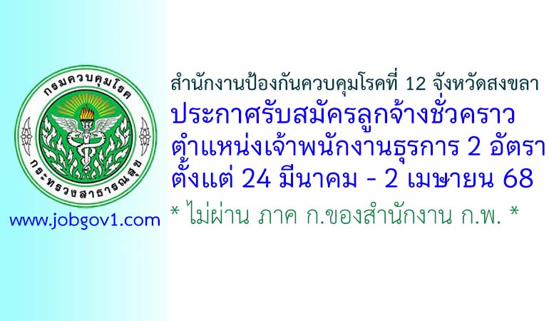 สำนักงานป้องกันควบคุมโรคที่ 12 จังหวัดสงขลา รับสมัครลูกจ้างชั่วคราว ตำแหน่งเจ้าพนักงานธุรการ 2 อัตรา ตั้งแต่ 24 มีนาคม – 2 เมษายน 2568