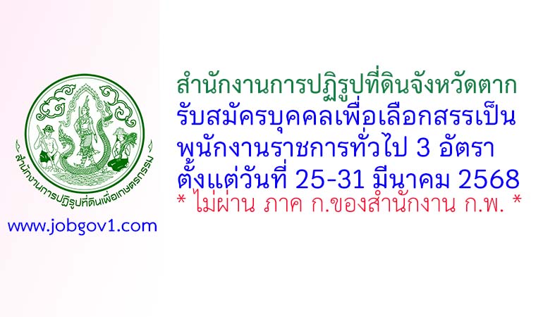 สำนักงานการปฏิรูปที่ดินจังหวัดตาก รับสมัครบุคคลเพื่อเลือกสรรเป็นพนักงานราชการทั่วไป 3 อัตรา ตั้งแต่วันที่ 25-31 มีนาคม 2568