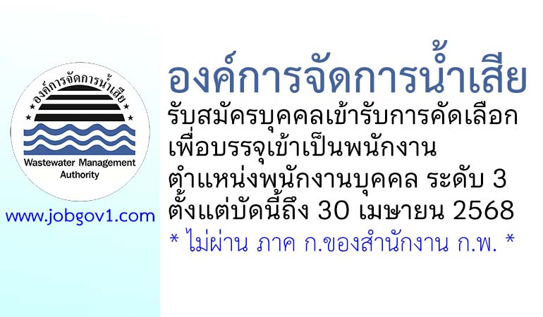 องค์การจัดการน้ำเสีย รับสมัครบุคคลเข้ารับการคัดเลือกเพื่อบรรจุเป็นพนักงาน ตำแหน่งพนักงานบุคคล ระดับ 3 ตั้งแต่บัดนี้ถึง 30 เมษายน 2568