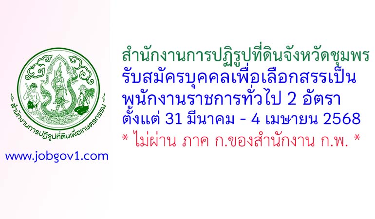 สำนักงานการปฏิรูปที่ดินจังหวัดชุมพร รับสมัครบุคคลเพื่อเลือกสรรเป็นพนักงานราชการทั่วไป 2 อัตรา ตั้งแต่ 31 มีนาคม – 4 เมษายน 2568