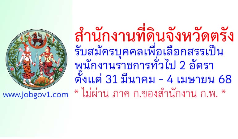 สำนักงานที่ดินจังหวัดตรัง รับสมัครบุคคลเพื่อเลือกสรรเป็นพนักงานราชการทั่วไป 2 อัตรา ตั้งแต่ 31 มีนาคม – 4 เมษายน 2568