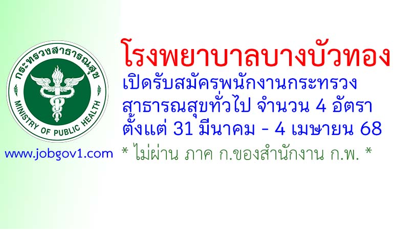 โรงพยาบาลบางบัวทอง รับสมัครพนักงานกระทรวงสาธารณสุขทั่วไป 4 อัตรา ตั้งแต่ 31 มีนาคม – 4 เมษายน 2568