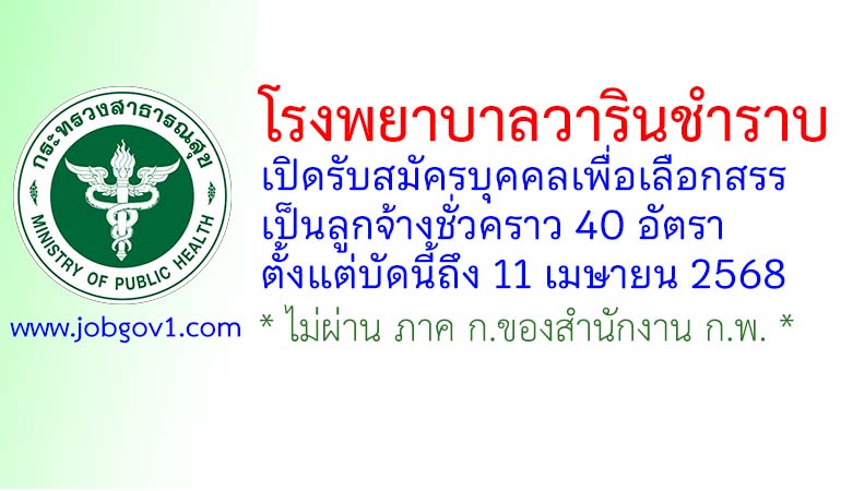 โรงพยาบาลวารินชำราบ รับสมัครบุคคลเพื่อเลือกสรรเป็นลูกจ้างชั่วคราว 40 อัตรา ตั้งแต่บัดนี้ถึง 11 เมษายน 2568