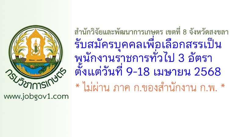 สำนักวิจัยและพัฒนาการเกษตร เขตที่ 8 จังหวัดสงขลา รับสมัครบุคคลเพื่อเลือกสรรเป็นพนักงานราชการทั่วไป 3 อัตรา ตั้งแต่วันที่ 9-18 เมษายน 2568