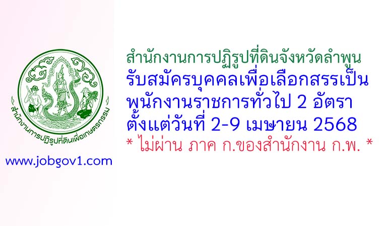 สำนักงานการปฏิรูปที่ดินจังหวัดลำพูน รับสมัครบุคคลเพื่อเลือกสรรเป็นพนักงานราชการทั่วไป 2 อัตรา ตั้งแต่วันที่ 2-9 เมษายน 2568