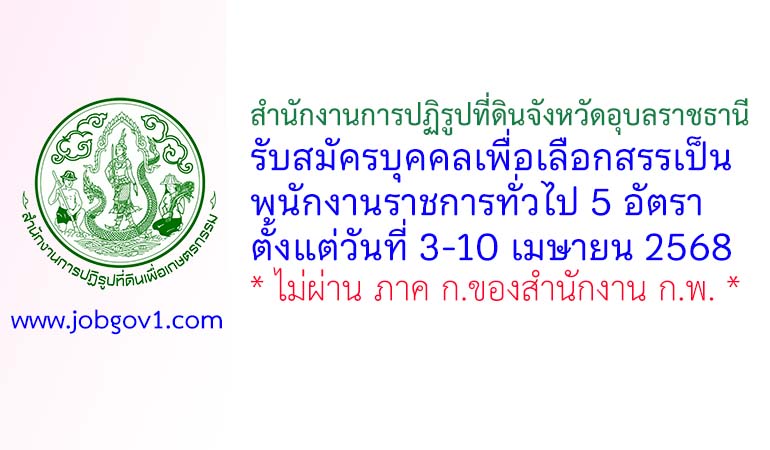 สำนักงานการปฏิรูปที่ดินจังหวัดอุบลราชธานี รับสมัครบุคคลเพื่อเลือกสรรเป็นพนักงานราชการทั่วไป 5 อัตรา ตั้งแต่วันที่ 3-10 เมษายน 2568