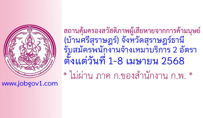 สถานคุ้มครองสวัสดิภาพผู้เสียหายจากการค้ามนุษย์ (บ้านศรีสุราษฎร์) จังหวัดสุราษฎร์ธานี รับสมัครพนักงานจ้างเหมาบริการ 2 อัตรา ตั้งแต่วันที่ 1-8 เมษายน 2568