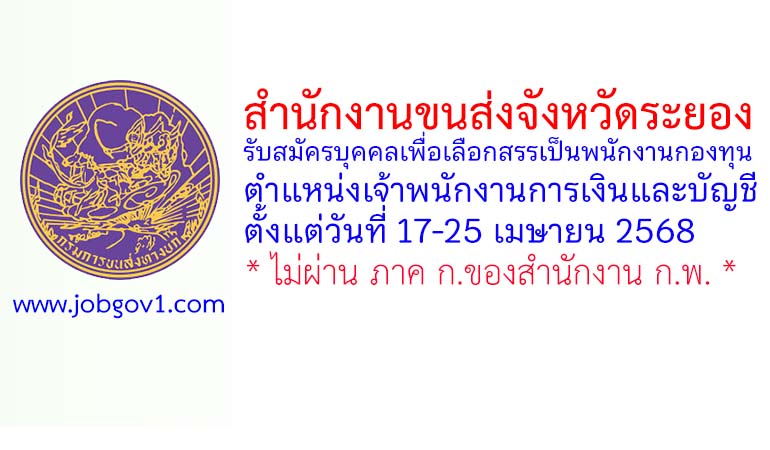สำนักงานขนส่งจังหวัดระยอง รับสมัครบุคคลเพื่อเลือกสรรเป็นพนักงานกองทุน ตำแหน่งเจ้าพนักงานการเงินและบัญชี ตั้งแต่วันที่ 17-25 เมษายน 2568