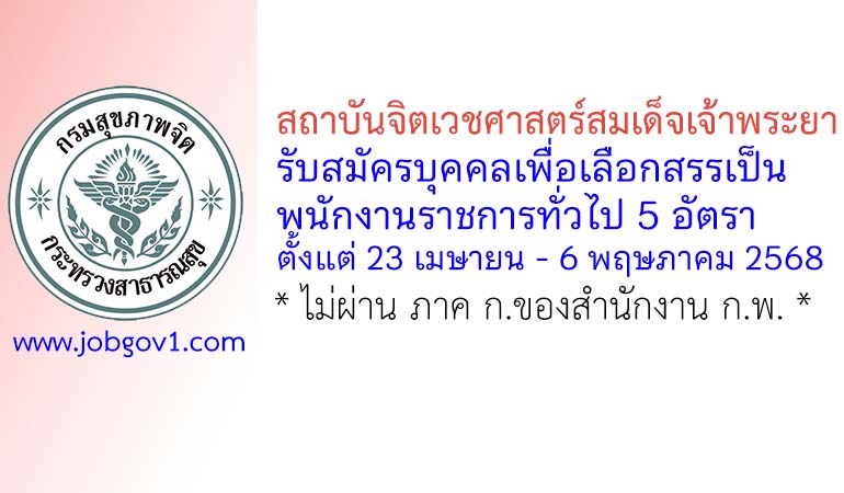 สถาบันจิตเวชศาสตร์สมเด็จเจ้าพระยา รับสมัครบุคคลเพื่อเลือกสรรเป็นพนักงานราชการทั่วไป 5 อัตรา ตั้งแต่ 23 เมษายน – 6 พฤษภาคม 2568