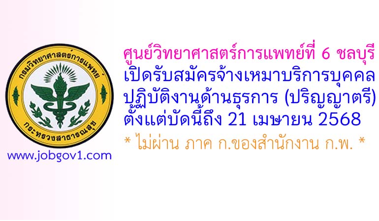 ศูนย์วิทยาศาสตร์การแพทย์ที่ 6 ชลบุรี รับสมัครจ้างเหมาบริการบุคคลปฏิบัติงานด้านธุรการ ตั้งแต่บัดนี้ถึง 21 เมษายน 2568