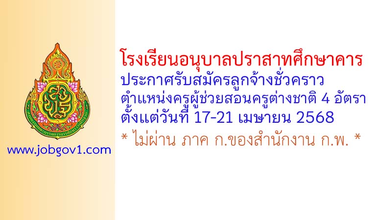 โรงเรียนอนุบาลปราสาทศึกษาคาร รับสมัครลูกจ้างชั่วคราว ตำแหน่งครูผู้ช่วยสอนครูต่างชาติ 4 อัตรา ตั้งแต่วันที่ 17-21 เมษายน 2568