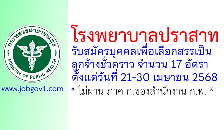 โรงพยาบาลปราสาท รับสมัครบุคคลเพื่อเลือกสรรเป็นลูกจ้างชั่วคราว 17 อัตรา ตั้งแต่วันที่ 21-30 เมษายน 2568