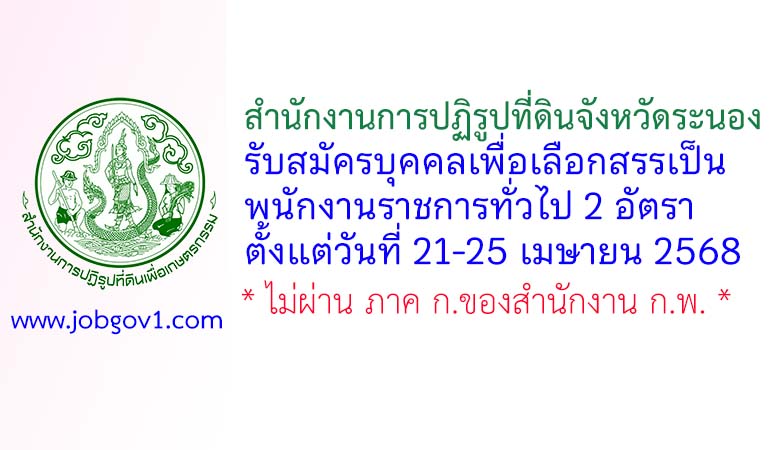 สำนักงานการปฏิรูปที่ดินจังหวัดระนอง รับสมัครบุคคลเพื่อเลือกสรรเป็นพนักงานราชการทั่วไป 2 อัตรา ตั้งแต่วันที่ 21-25 เมษายน 2568