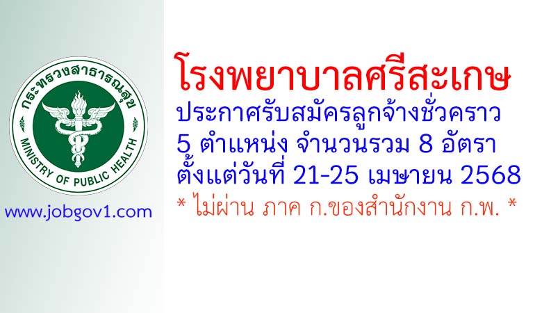 โรงพยาบาลศรีสะเกษ รับสมัครลูกจ้างชั่วคราว 8 อัตรา ตั้งแต่วันที่ 21-25 เมษายน 2568