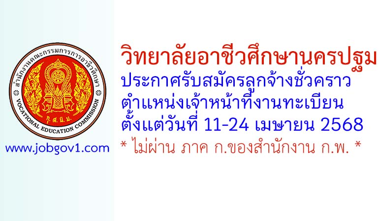 วิทยาลัยอาชีวศึกษานครปฐม รับสมัครลูกจ้างชั่วคราว ตำแหน่งเจ้าหน้าที่งานทะเบียน ตั้งแต่วันที่ 11-24 เมษายน 2568