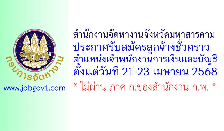 สำนักงานจัดหางานจังหวัดมหาสารคาม รับสมัครลูกจ้างชั่วคราว ตำแหน่งเจ้าพนักงานการเงินและบัญชี ตั้งแต่วันที่ 21-23 เมษายน 2568