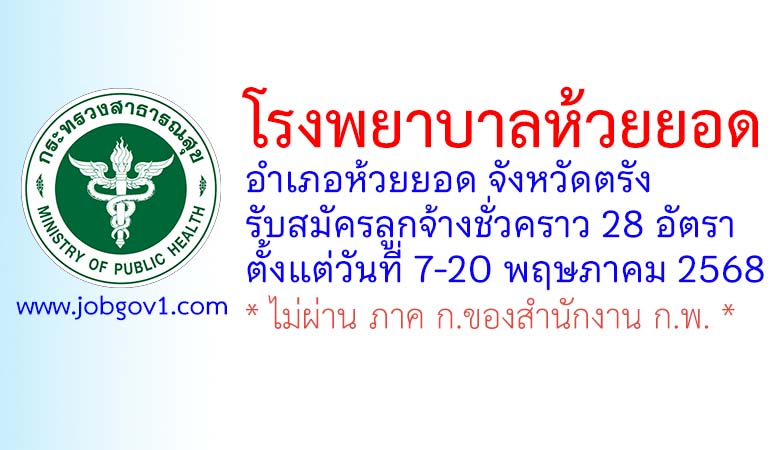 โรงพยาบาลห้วยยอด รับสมัครลูกจ้างชั่วคราว 28 อัตรา ตั้งแต่วันที่ 7-20 พฤษภาคม 2568