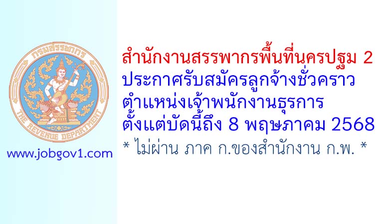 สำนักงานสรรพากรพื้นที่นครปฐม 2 รับสมัครลูกจ้างชั่วคราว ตำแหน่งเจ้าพนักงานธุรการ ตั้งแต่บัดนี้ถึง 8 พฤษภาคม 2568