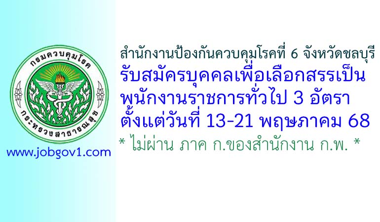 สำนักงานป้องกันควบคุมโรคที่ 6 จังหวัดชลบุรี รับสมัครบุคคลเพื่อเลือกสรรเป็นพนักงานราชการทั่วไป 3 อัตรา ตั้งแต่วันที่ 13-21 พฤษภาคม 2568