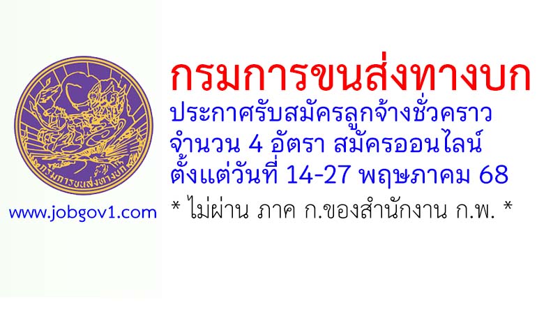 กรมการขนส่งทางบก รับสมัครลูกจ้างชั่วคราว 4 อัตรา ตั้งแต่วันที่ 14-27 พฤษภาคม 2568