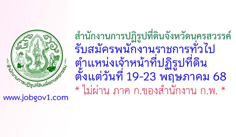 สำนักงานการปฏิรูปที่ดินจังหวัดนครสวรรค์ รับสมัครพนักงานราชการทั่วไป ตำแหน่งเจ้าหน้าที่ปฏิรูปที่ดิน ตั้งแต่วันที่ 19-23 พฤษภาคม 2568