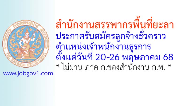 สำนักงานสรรพากรพื้นที่ยะลา รับสมัครลูกจ้างชั่วคราว ตำแหน่งเจ้าพนักงานธุรการ ตั้งแต่วันที่ 20-26 พฤษภาคม 2568
