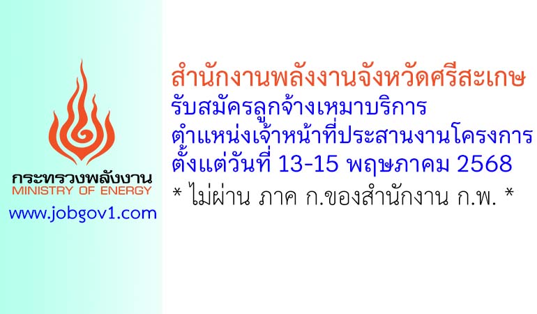 สำนักงานพลังงานจังหวัดศรีสะเกษ รับสมัครลูกจ้างเหมาบริการ ตำแหน่งเจ้าหน้าที่ประสานงานโครงการ ตั้งแต่วันที่ 13-15 พฤษภาคม 2568