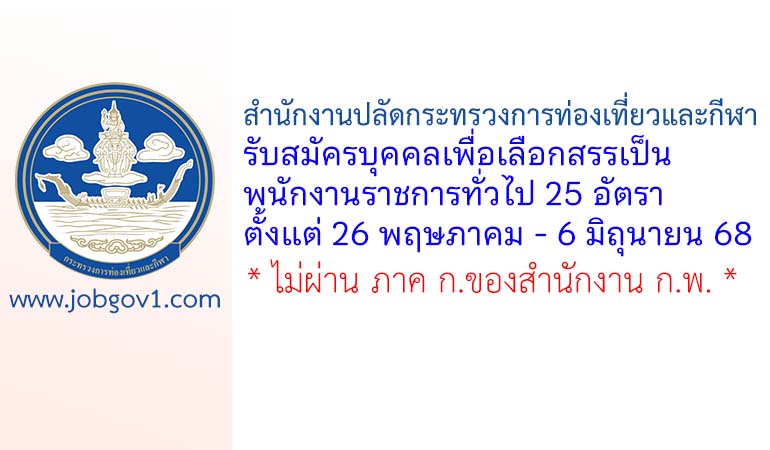 สำนักงานปลัดกระทรวงการท่องเที่ยวและกีฬา รับสมัครบุคคลเพื่อเลือกสรรเป็นพนักงานราชการทั่วไป 25 อัตรา ตั้งแต่ 26 พฤษภาคม – 6 มิถุนายน 2568