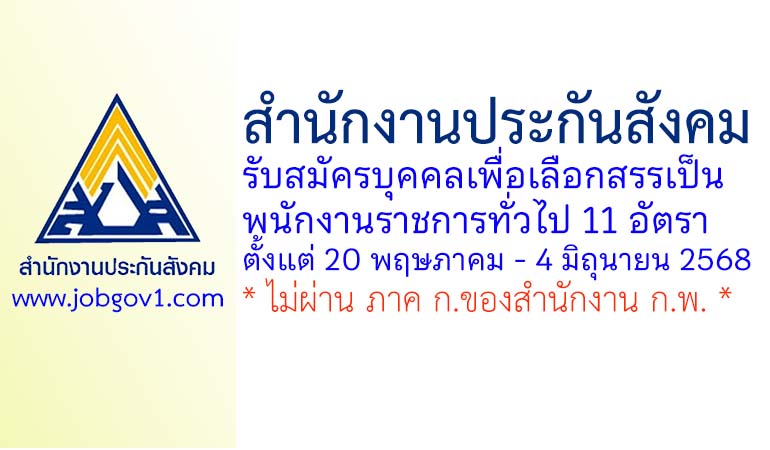 สำนักงานประกันสังคม รับสมัครบุคคลเพื่อเลือกสรรเป็นพนักงานราชการทั่วไป 11 อัตรา ตั้งแต่ 20 พฤษภาคม – 4 มิถุนายน 2568