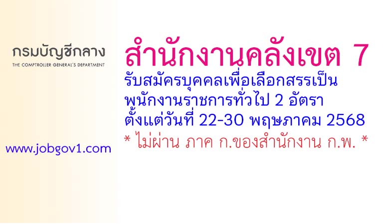 สำนักงานคลังเขต 7 รับสมัครบุคคลเพื่อเลือกสรรเป็นพนักงานราชการทั่วไป 2 อัตรา ตั้งแต่วันที่ 22-30 พฤษภาคม 2568