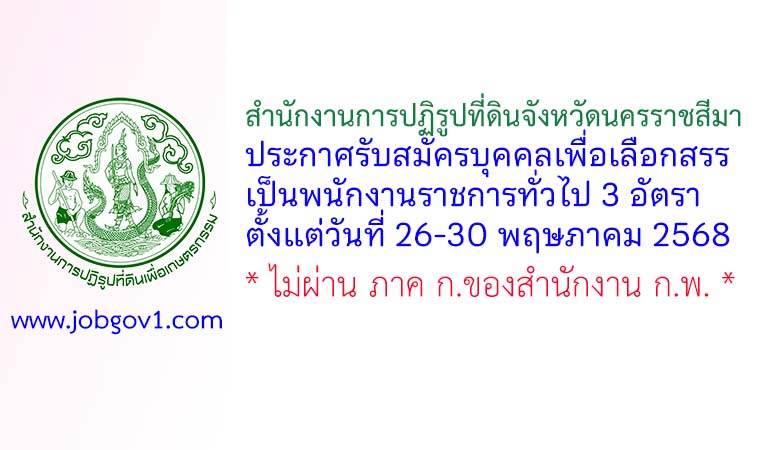 สำนักงานการปฏิรูปที่ดินจังหวัดนครราชสีมา รับสมัครบุคคลเพื่อเลือกสรรเป็นพนักงานราชการทั่วไป 4 อัตรา ตั้งแต่วันที่ 26-30 พฤษภาคม 2568