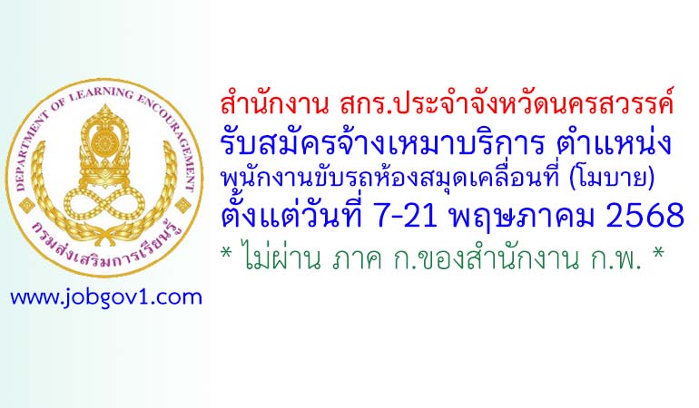 สำนักงาน สกร.ประจำจังหวัดนครสวรรค์ รับสมัครพนักงานจ้างเหมาบริการ ตำแหน่งพนักงานขับรถห้องสมุดเคลื่อนที่ (โมบาย) ตั้งแต่วันที่ 7-21 พฤษภาคม 2568