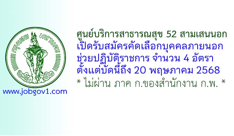 ศูนย์บริการสาธารณสุข 52 สามเสนนอก รับสมัครคัดเลือกบุคคลภายนอกช่วยปฏิบัติราชการ 4 อัตรา ตั้งแต่บัดนี้ถึง 20 พฤษภาคม 2568