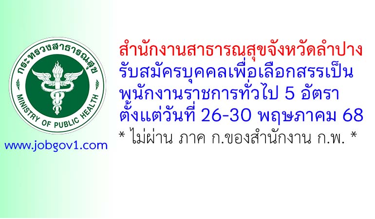 สำนักงานสาธารณสุขจังหวัดลำปาง รับสมัครบุคคลเพื่อเลือกสรรเป็นพนักงานราชการทั่วไป 5 อัตรา ตั้งแต่วันที่ 26-30 พฤษภาคม 2568
