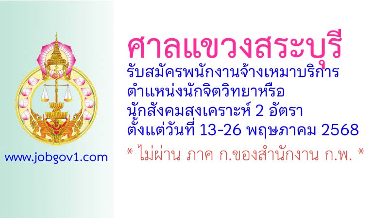 ศาลแขวงสระบุรี รับสมัครพนักงานจ้างเหมาบริการ ตำแหน่งนักจิตวิทยาหรือนักสังคมสงเคราะห์ 2 อัตรา ตั้งแต่วันที่ 13-26 พฤษภาคม 2568