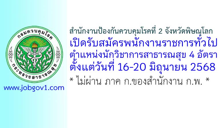 สำนักงานป้องกันควบคุมโรคที่ 2 จังหวัดพิษณุโลก รับสมัครพนักงานราชการทั่วไป ตำแหน่งนักวิชาการสาธารณสุข 4 อัตรา ตั้งแต่วันที่ 16-20 มิถุนายน 2568