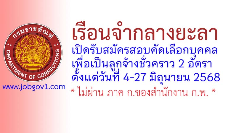 เรือนจำกลางยะลา รับสมัครสอบคัดเลือกบุคคลเพื่อเป็นลูกจ้างชั่วคราว 2 อัตรา ตั้งแต่วันที่ 4-27 มิถุนายน 2568