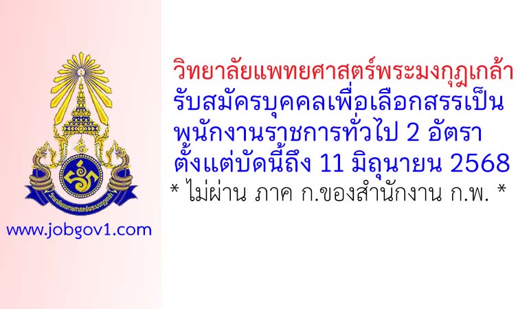 วิทยาลัยแพทยศาสตร์พระมงกุฎเกล้า รับสมัครบุุคคลเพื่อเลือกสรรเป็นพนักงานราชการทั่วไป 2 อัตรา ตั้งแต่บัดนี้ถึง 11 มิถุนายน 2568