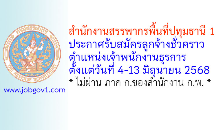 สำนักงานสรรพากรพื้นที่ปทุมธานี 1 รับสมัครลูกจ้างชั่วคราว ตำแหน่งเจ้าพนักงานธุรการ ตั้งแต่วันที่ 4-13 มิถุนายน 2568