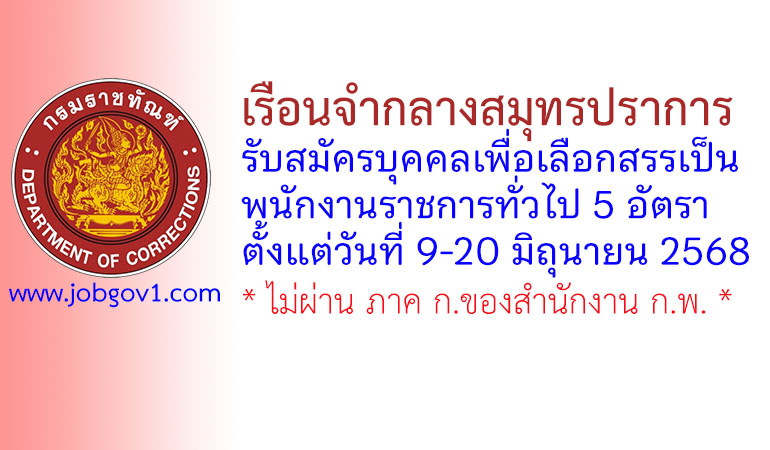 เรือนจำกลางสมุทรปราการ รับสมัครบุคคลเพื่อเลือกสรรเป็นพนักงานราชการทั่วไป 5 อัตรา ตั้งแต่วันที่ 9-20 มิถุนายน 2568