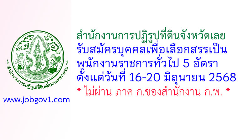 สำนักงานการปฏิรูปที่ดินจังหวัดเลย รับสมัครบุคคลเพื่อเลือกสรรเป็นพนักงานราชการทั่วไป 5 อัตรา ตั้งแต่วันที่ 16-20 มิถุนายน 2568