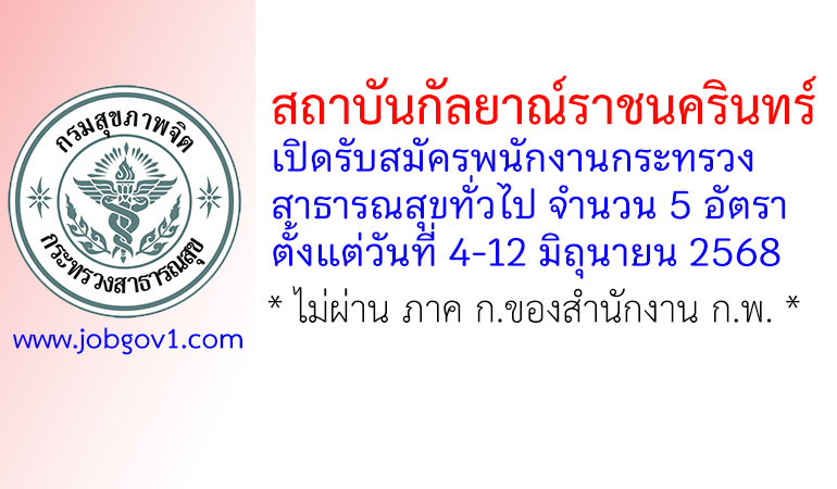 สถาบันกัลยาณ์ราชนครินทร์ รับสมัครพนักงานกระทรวงสาธารณสุขทั่วไป 5 อัตรา ตั้งแต่วันที่ 4-12 มิถุนายน 2568