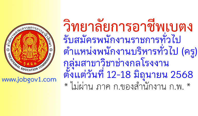 วิทยาลัยการอาชีพเบตง รับสมัครพนักงานราชการทั่วไป ตำแหน่งพนักงานบริหารทั่วไป (ครู) กลุ่มวิชาช่างกลโรงงาน ตั้งแต่วันที่ 12-18 มิถุนายน 2568
