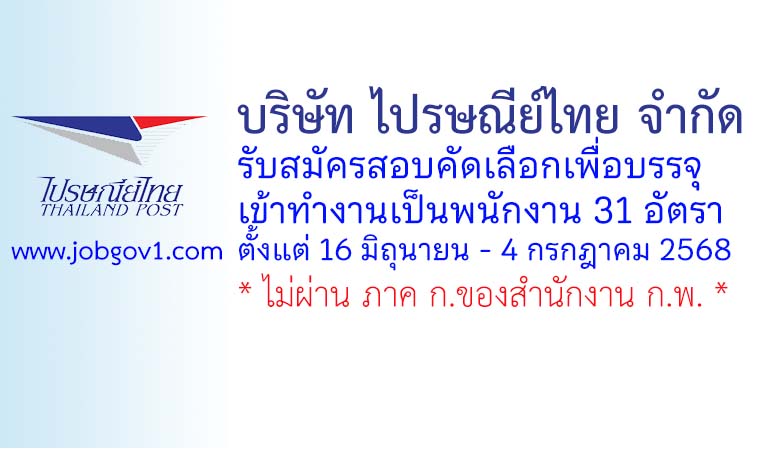 บริษัท ไปรษณีย์ไทย จำกัด รับสมัครสอบคัดเลือกเพื่อบรรจุเข้าทำงานเป็นพนักงาน 31 อัตรา ตั้งแต่ 16 มิถุนายน – 4 กรกฎาคม 2568