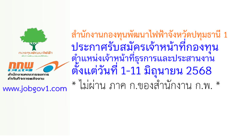สำนักงานกองทุนพัฒนาไฟฟ้าจังหวัดปทุมธานี 1 รับสมัครเจ้าหน้าที่กองทุน ตำแหน่งเจ้าหน้าที่ธุรการและประสานงาน ตั้งแต่วันที่ 1-11 มิถุนายน 2568