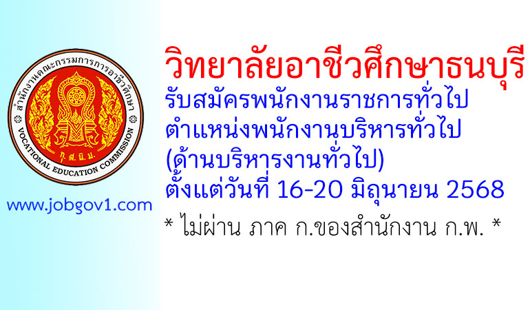 วิทยาลัยอาชีวศึกษาธนบุรี รับสมัครพนักงานราชการทั่วไป ตำแหน่งพนักงานบริหารทั่วไป (ด้านบริหารงานทั่วไป) ตั้งแต่วันที่ 16-20 มิถุนายน 2568