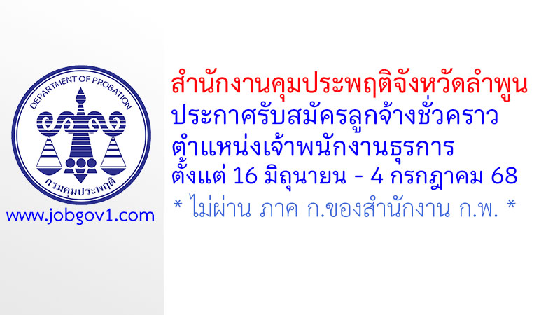 สำนักงานคุมประพฤติจังหวัดลำพูน รับสมัครลูกจ้างชั่วคราว ตำแหน่งเจ้าพนักงานธุรการ ตั้งแต่ 16 มิถุนายน – 4 กรกฎาคม 2568