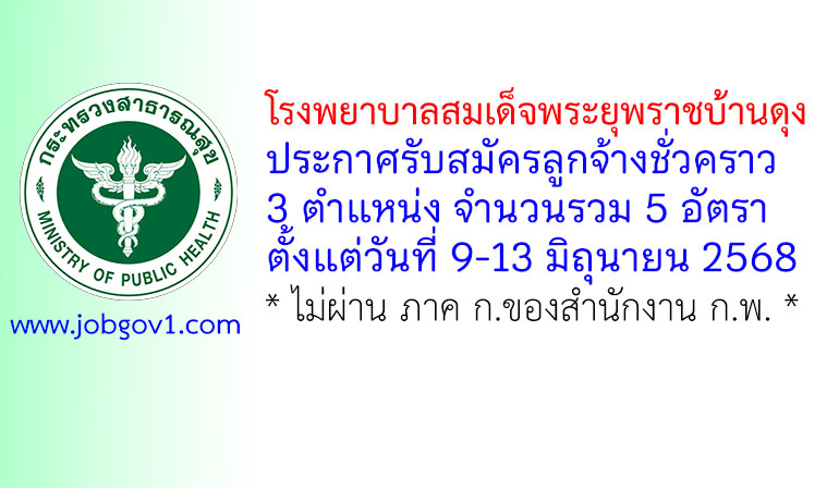โรงพยาบาลสมเด็จพระยุพราชบ้านดุง รับสมัครลูกจ้างชั่วคราว 5 อัตรา ตั้งแต่วันที่ 9-13 มิถุนายน 2568