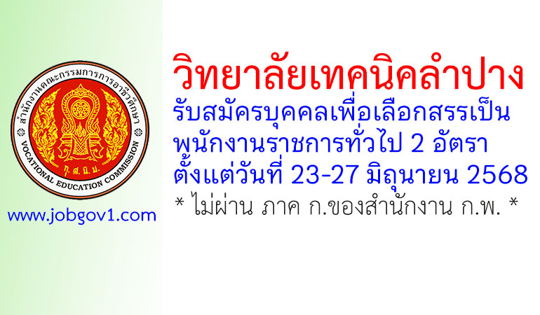 วิทยาลัยเทคนิคลำปาง รับสมัครบุคคลเพื่อเลือกสรรเป็นพนักงานราชการทั่วไป 2 อัตรา ตั้งแต่วันที่ 23-27 มิถุนายน 2568