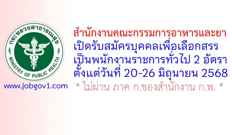 สำนักงานคณะกรรมการอาหารและยา รับสมัครบุคคลเพื่อเลือกสรรเป็นพนักงานราชการทั่วไป 2 อัตรา ตั้งแต่วันที่ 20-26 มิถุนายน 2568
